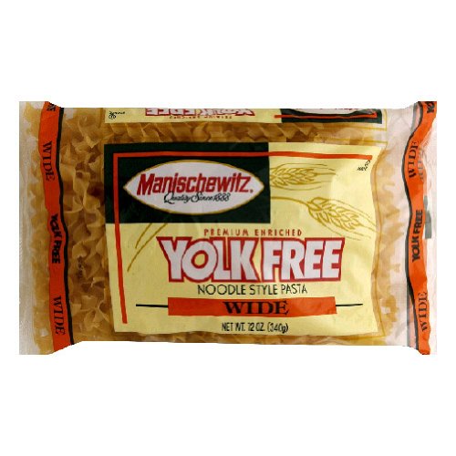 Manischewitz Yolk Free Wide Noodles comes in a 12 ounce bag. Our Noodles are slow cooked the old fashioned way for a fuller, richer flavor. No one ever thought we could do it but we even make egg, yolk-free, and whole grain noodles.